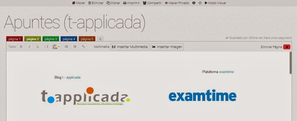 Apuntes Esta funcionalidad es particularmente versátil. Las notas o apuntes se pueden crear en cajas de texto que luego podemos mover a nuestro gusto. Al texto le podemos aplicar formato como tamaño, tipo y color, pero también lo podemos enlazar a alguna página web o alguna sección de nuestro blog. Podemos separar nuestras anotaciones por páginas. En cada una de ellas podemos insertar imágenes y material multimedia, el cual también podemos mover según lo necesitemos.
