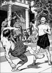Odysseus' muscles are revealed by Athena and he easily overpowers Irus.