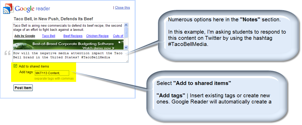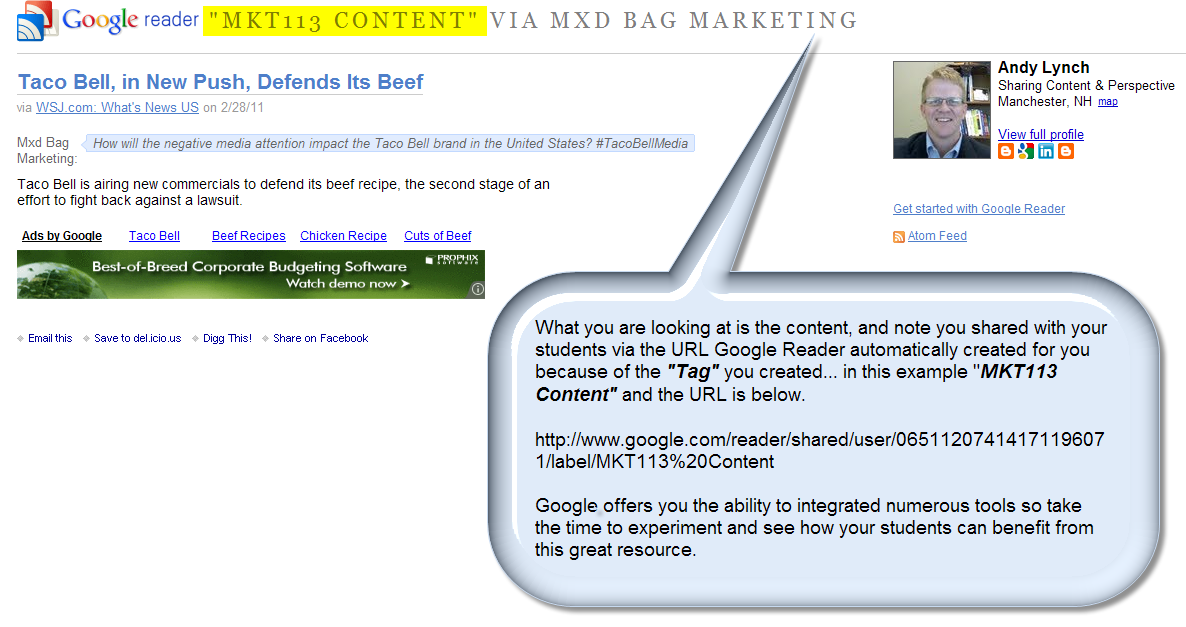 Congratulations! You have just begun the fun process of integrating Google Reader in your courses and sharing relevant content that DOES NOT come from an expensive textbook.