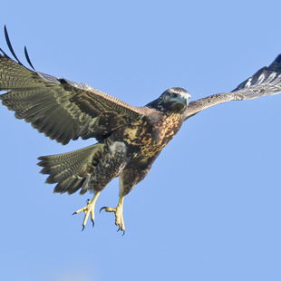 A águia chilena é identificada no voo por sua cauda em forma de cunha curta que projeta-se mal em suas asas longas e largas. Plana muito próximo a áreas montanhosas onde fica por muito tempo planando a procura de comida, conhecida também como gavião-pé-de-serra.