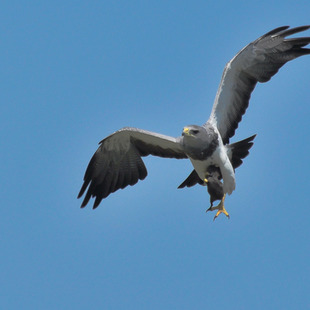 Essa ave apresenta um voo poderoso e veloz, dotada de grandes olhos, aspectos estes que auxiliam na caça às suas presas preferenciais, outras aves (como filhotes de joão-de-barro e andorinhões) , cobras e até mesmo pequenos mamíferos, como coelhos e mocós. Inclusive observou-se uma destas águias destruindo uma casa de joão-de-barro para se apoderar de seu conteúdo. Pode também comer carniça ocasionalmente, o que lhe confere a característica de ave saprófaga eventual. Em Belo Horizonte verificou-se que essa espécie se adaptou a consumir pombos domésticos.
