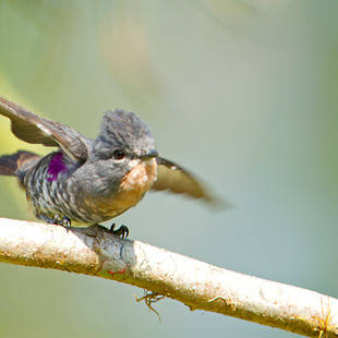 Representante singular de asas longas, cauda curta e plumagem macia e rente. É cinzento com a garganta e as coberteiras inferiores da cauda rosa-pardacentas, partes inferiores transfasciadas de branco e cinzento lembrando remotamente aves do gênero Picumnus. O macho possui ao lado do peito, oculto sob as asas, um tufo de penas longas, sedosas e violáceas que faltam na fêmea. Quando excitado exibe a zona lilás, eriçando-a e afastando um pouco as asas.