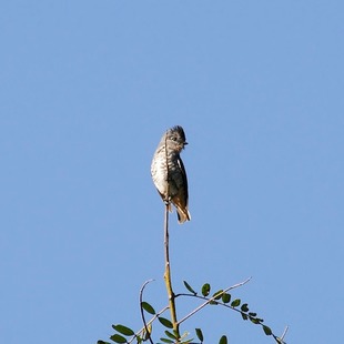Sua vocalização é um assobio agudo e bissilábico, um descendente “si-si” lembrando fim-fim (Euphonia chlorotica).