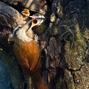 Nidifica em árvores velhas, usando em geral ocos abandonados por pica-paus. Reveste a cavidade com folhas e cascas de árvores, e aí põe dois ovos branco-puros.