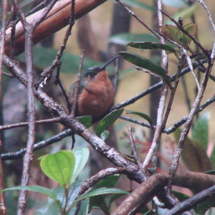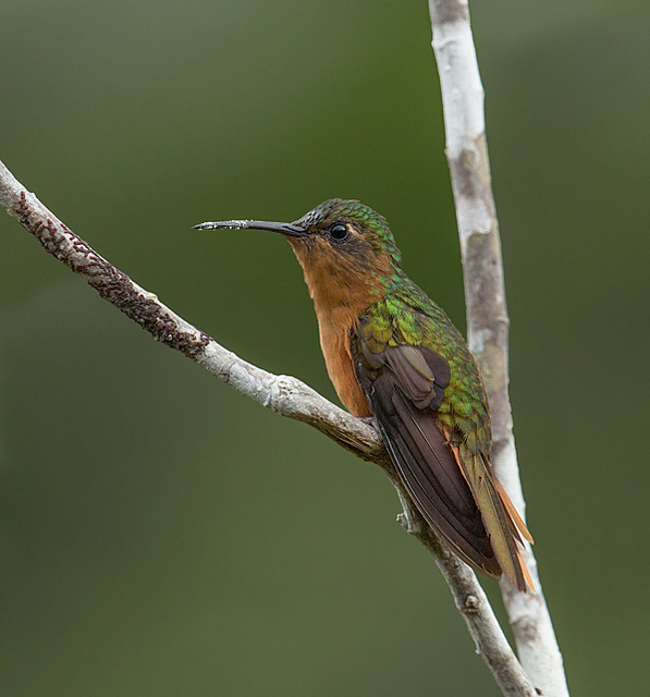Descrição física… 10,4 cm de comprimento total. Bico um tanto curto e ligeiramente curvado. Partes superiores de cor verde acobreado (um tanto brilhante). Partes inferiores inteiramente acaneladas. Ambos os sexos similares em aparência.(HILTY, 2003).