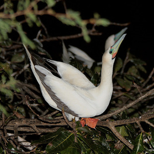 Nidifica em ilhas costeiras com vegetação abundante. Não sazonal, pode começar a criação em qualquer mês. Faz um ninho de gravetos, raso como uma plataforma, sobre árvores e arbustos. Coloca 1 ovo apenas, que choca com os pés em cima, durante cerca de 40 dias. O filhote nasce nu, depois adquire uma plumagem branca e macia. Após aproximadamente 4 ou 5 meses abandona o ninho, já com capacidade de vôo. Atinge a maturidade sexual com 2 a 3 anos.