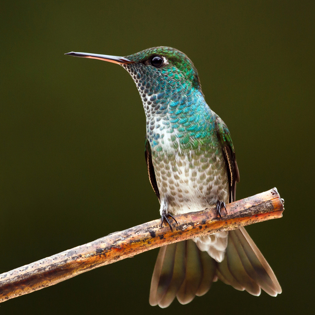 Mede 8,5 cm de comprimento. Quando é possível observar a cauda, nota-se que a mesma é cinza, com uma faixa sub-terminal escura e ponta clara. Fora isso, o tom esverdeado da plumagem é mais nítido, com a garganta verde brilhante e de tons iridescentes azulados. O branco da barriga continua-se pelo peito sem estreitar-se tanto como no beija-flor-de-garganta-verde. O bico é relativamente menor e mais escuro. Essa espécie reúne várias subespécies, cujas plumagens variam pela maior ou menor extensão do verde-brilhante da fronte ou pela presença ou ausência de branco na garganta e no centro da barriga.
