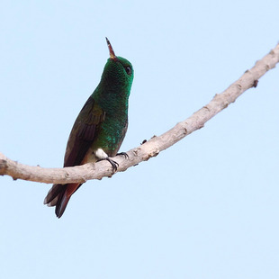 Mede 10 cm de comprimento. Sua plumagem contrasta o verde-brilhante das partes inferiores com os tons de cobre-averelhado da cauda e das supracaudais.