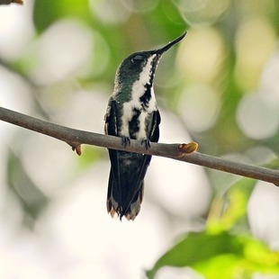 A fêmea possui lado dorsal, coberteiras das asas e flancos verdes até verdes azulados; lado ventral branco, com uma larga faixa longitudinal preta desde o mento até o crisso; lado dorsal da cauda verde, lado inferior azul aço com pontas brancas nos pares laterais das retrizes; asas púrpura enegrecidas; bico e pés pretos. Medidas: comp total. 97mm, asa. 53mm, cauda. 29mm, bico. 15mm.