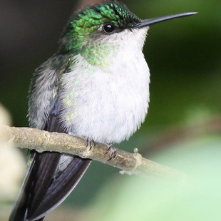 Mede aproximadamente 11,1 centímetros. Verde brilhante de boné azul-violeta, tufos do crisso brancos, retrizes azul-aço, bico negro. A fêmea apresenta as partes inferiores brancas sujas, retrizes laterais com pontas brancas, testa e lado inferior às vezes lavados de canela.