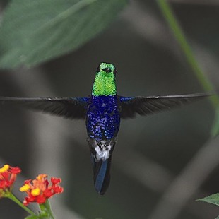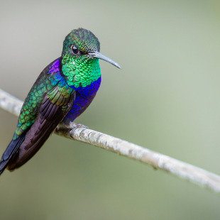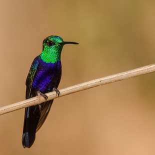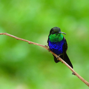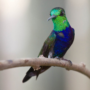 Mede cerca de 9,7 cm de comprimento. Macho com partes superiores esverdeadas, garganta verde-metálica, peito e barriga azul-violeta-brilhante; fêmea com as partes inferiores cinza.
