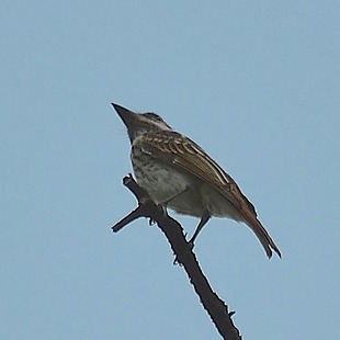 Mede 18 centímetros. Muito semelhante a uma subespécie do bem-te-vi-rajado, (Myiodynastes maculatus maculatus).