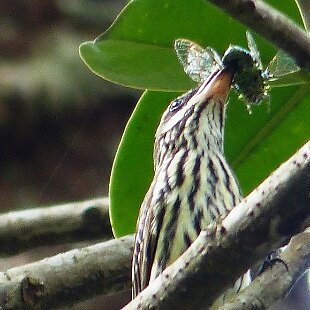 A maior das espécies rajadas da família, destaca-se pelo enorme bico e cabeça desproporcional ao corpo. É do tamanho do bem-te-vi. As listras superciliares brancas não se unem na nuca, como nas outras espécies de plumagem rajada.
