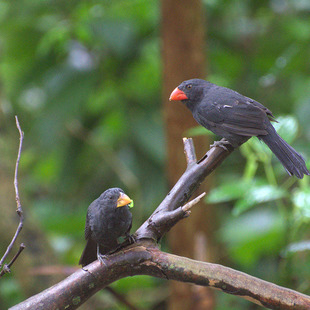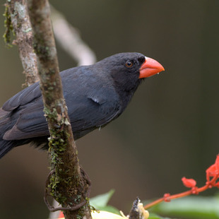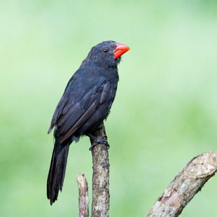 Mede cerca de 20,0cm de comprimento, possui a máscara e pescoço anterior negros, partes superiores cinza pardacentas com reflexos anilados especialmente no dorso e nas asas, as partes inferiores são cinza amareladas claras. As rêmiges são negras com bordos interiores brancos. As retrizes são negras, o bico é grosso e laranja avermelhado. A fêmea possui as mesmas cores porém mais atenuadas, o bico é vermelho pálido. O jovem apresenta as partes superiores, cabeça e pescoço anterior pardos, bico anegrado e partes inferiores estriadas.