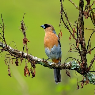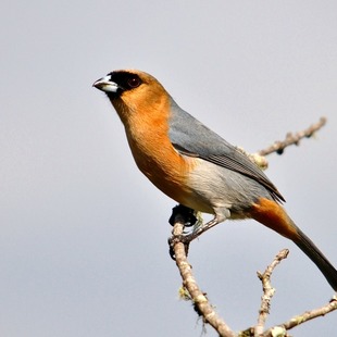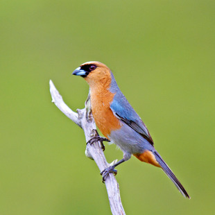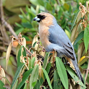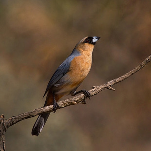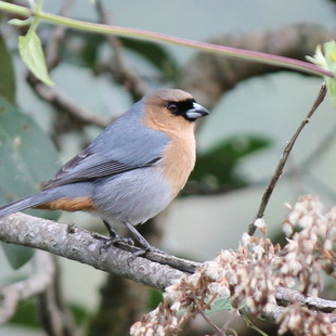 A plumagem do dorso é azul-acinzentada, tem uma máscara negra na face. Na parte inferior, garganta, peito e barriga são acanelados. O baixo-ventre é branco-acinzentado. Espécie sem dimorfismo sexual.