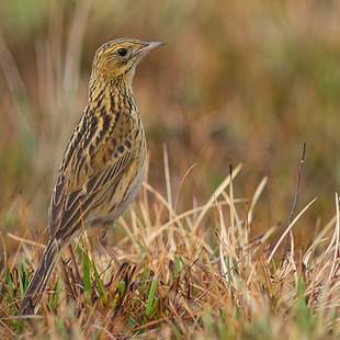 Plumagem dorsal fortemente estriada de preto e amarelo e o ventre esbranquiçado. Destacam-se o bico, o tarso e os dedos bastante longos, além da unha hálux (dedo I), que chega a atingir 15 mm de comprimento (Sick, Ornitologia Brasileira, 1997)