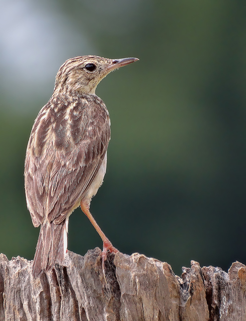 A plumagem é uma mescla de rajados e bolas cinza escuras contra um fundo claro. Na barriga, um pouco mais amarelada, sem as cores escuras. A silhueta é de uma ave longilínea, acentuada pelo bico fino e a longa cauda. Pernas longas, finas e alaranjadas ou amareladas.