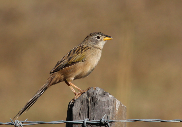 A longa cauda (cerca de metade do comprimento total da ave) é capaz de identificá-lo à distância, especialmente quando pousa nos pendões mais altos das gramíneas ou galhos expostos dos arbustos. Nessas ocasiões, mantém a cauda entreaberta, ficando nítida a diferença de tamanho entre suas penas. As centrais maiores, com as outras gradualmente menores. A cauda também auxilia na identificação em voo, ao mover-se um pouco para cima e para baixo, de maneira única. Pousado, as longas pernas amareladas também ajudam a determinar essa espécie.