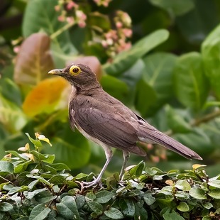 Mede 22,0 centímetros. Pardo, mais claro por baixo. Área amarela em torno do oho. Garganta rajada. Bico amarelo.