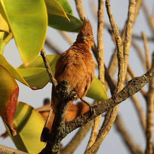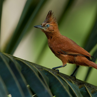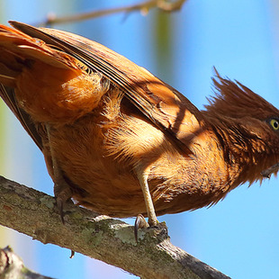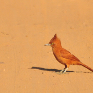 Mede cerca de 25 cm de comprimento. Apresenta plumagem ruiva uniforme, íris amarela e um longo topete sobre o píleo.