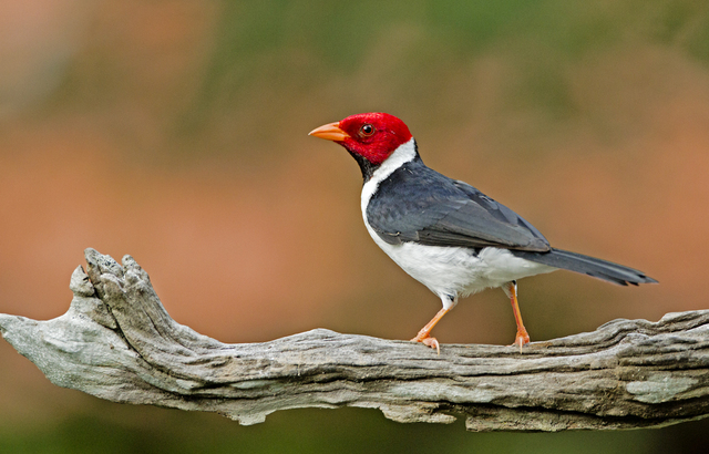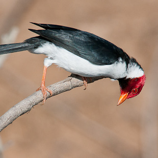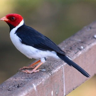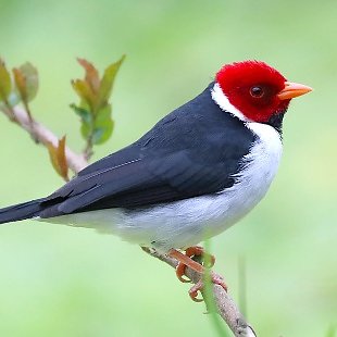Mede 16,5cm de comprimento. Não há dimorfismo sexual. Macho e fêmea são idênticos, com o característico vermelho da cabeça contrastando com o restante das cores e com o bico amarelo alaranjado. As aves juvenis saem do ninho com as costas e o babador acinzentados. Cabeça parda. Os filhotes estão com os pais nos bandos a partir de dezembro. Nos meses seguintes, começam a mudar e aparecem penas com as cores definitivas. Entre janeiro e julho, os juvenis estão com uma mescla de plumagem, parecendo estar “sujos”.