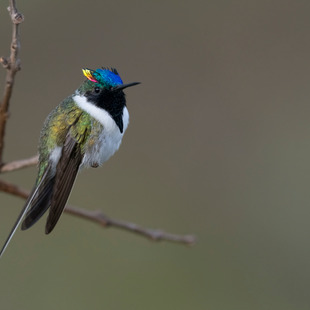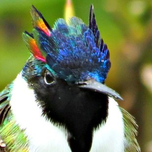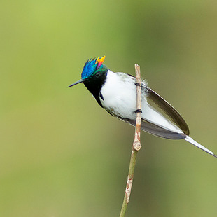 O macho dessa espécie tem um espetacular topete bipartido, formando dois chifres com penas vermelhas, azuis e douradas, em ambos os lados de uma coroa com penas irisdiscentes azuis-escuras. O dorso é bronze-esverdeado, a garganta e a parte superior do peito são negras, enquanto a barriga e as laterais do pescoço são brancas. A cauda é longa e pontuda, e mostra um escuro V no branco da cauda quando a ave é vista por baixo em pleno voo.
