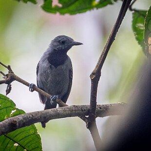 Mede 9 cm de comprimento. Macho de coloração geral cinza escura, com área negra cobrindo garganta e peito, asas negras com duas barras brancas bem visíveis, cauda negra sem pontas claras. Fêmea de coloração cinza nas pares superiores, asas negras com pintas beges formando barras, e lado inferior ocráceo pálida.