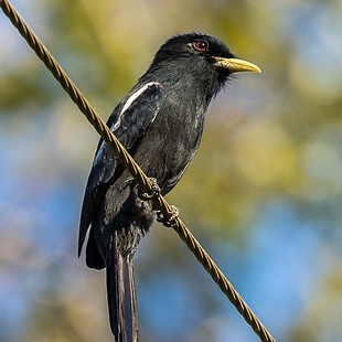 Mede 20 centímetros. Negro de bico amarelo. Algum desenho branco nas coberteiras superiores das asas, lado inferior das asas e encontro.