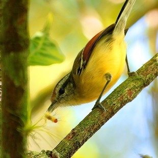 Vive aos pares, principalmente acompanhando bandos mistos de aves,tanto os formados por pásaros insetívoros quanto os frugívoros, procurando insetos em emaranhados de cipós nas copas e nas bordas de florestas.