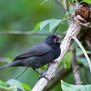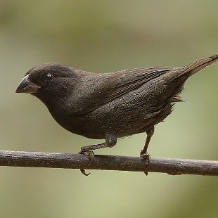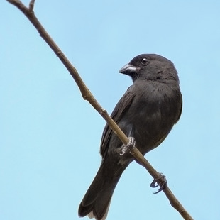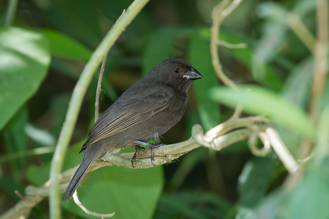 Mede 12,5cm. de comprimento. O macho é totalmente fuligem-escuro, às vezes cambiando ou para o negro-carvão ou para o oliváceo. A fêmea possui partes superiores pardo-acinzentadas-escuras, partes inferiores mais claras, ventre esbranquiçado e bico preto com a mandíbula amarela. Ambos os sexos de pernas pardo-escuras.