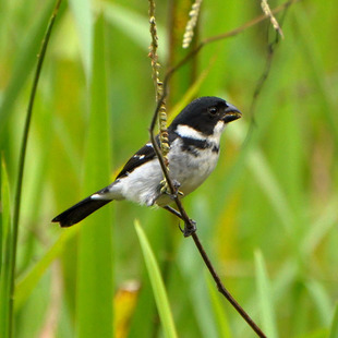 Mede 11cm. de comprimento. O macho é preto-brilhante nas partes superiores, com a garganta branca, cuja tonalidade se estende para cima, nas laterais do pescoço, formando um colar, por vezes incompleto. Possui ainda uma faixa preta no peito, duas “barras” brancas bem distintivas nas asas, sendo que a segunda pode ser reduzida, e as demais partes inferiores brancas. A fêmea e o filhote são marrom-oliváceos, mais claros nas partes inferiores. O canto lembra o de Sporophila caerulescens, sendo entretanto mais prolongado.