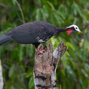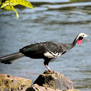 Mede de 69 a 76cm de comprimento e pesa de 1,10 a 1,30kg. Tem coloração geral negra e branca, face nua, topete e barbela característicos. Ao contrário de Aburria cumanensis tem a barbela vermelha.