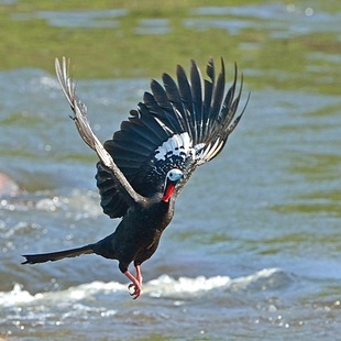 Vários assobios, “uit, quiiu, bak-bak”; série ascendente de vários “uii”. A espécie emite um ruflar ou “rasgar” de asas nas primeiras horas da manhã, por meio das primárias especialmente modificadas para a produção de sons, comum aos gêneros Aburria e Penelope.