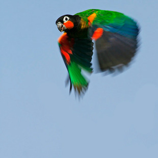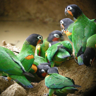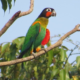 Mede 25cm de comprimento.Curioso psitacídeo da Amazônia,devido às bochechas alaranjadas em contraste com a plumagem de cor escura da cabeça.