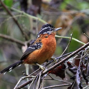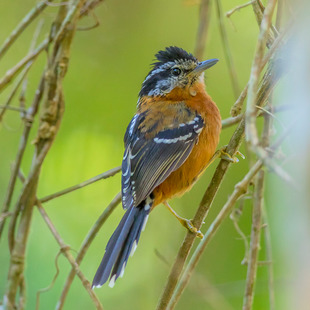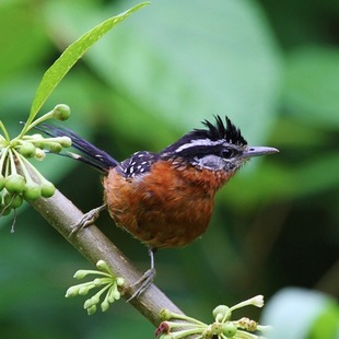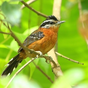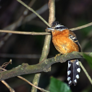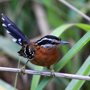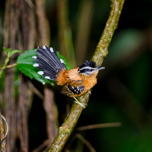 Atinge 14 cm de comprimento. Parte de cima do corpo preto e branco, região acima da cauda castanha, parte de baixo do corpo cor de ferrugem. Asas pretas com pintas brancas, cauda preta com a ponta pintada de branco. Lista branca acima e abaixo da região dos olhos. Vive no sub-bosque de florestas primárias ou secundárias da Mata Atlântica muitas vezes associado a taquarais, emaranhados de cipó e clareiras.
