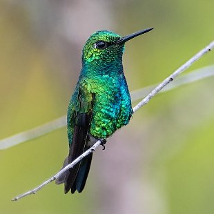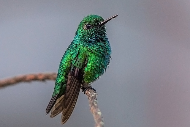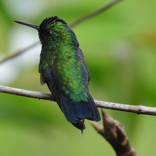 Via de regra, as aves das 3 subespécies têm todo o corpo verde até verde dourado cintilante intenso com o lado ventral verde nos machos (fêmeas lado ventral cinza-claro até esbranquiçado) e cauda reta ou levemente recortadas. C. m. mellisugus possui garganta preponderantemente,lado dorsal verde dourado, pouquíssimo verde azulada e pontas das rectrizes externas de 5 a 5,5 mm. C. m. subfurcatus possui Garganta preponderantemente azul com um pouco de reluzir verde azulado, região loreal mais para verde dourado e recorte da cauda de 3 a 4mm, lado dorsal verde dourado e pontas das rectrizes externas de cor cinza (3 a 3,3mm). C. m. phaeopygus possui Garganta preponderantemente azul com um pouco de reluzir verde azulado, região loreal mais verde; recorte da cauda de 2mm e lado dorsal verde azulado; com pontas das rectrizes externas com 1mm de cinza.