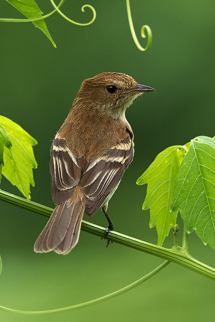 Aspecto semelhante ao enferrujado (Lathrotriccus euleri) e guaracavuçu (Cnemotriccus fuscatus), tendo como característica mais importante o peito fortemente estriado, marca ausente nas outras espécies. A leve listra superciliar é menos nítida do que no guaracavuçu, enquanto o bico é escuro com uma leve borda clara.Possui também um topete amarelo no píleo ou alto da cabeça, de difícil visualização.
