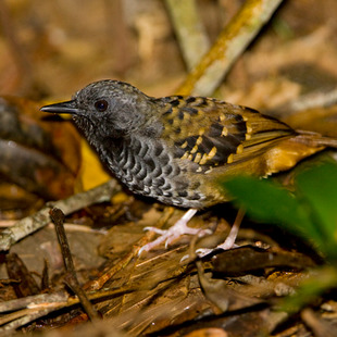 Os casais vasculham a serrapilheira à procura de artrópodes como insetos e aranhas e, aparentemente, não segue bandos mistos. Locomove-se pelo chão caminhando entre os arbustos, galhos e folhas secas. Podem ser observados forrageando.
