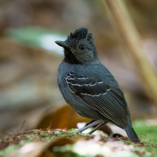 Mede 14,5 cm de comprimento. Macho de cor predominante cinza escuro, com coroa e garganta negras. Asas com barras negras e brancas. Íris cinza. Fêmea marrom oliváceo nas partes superiores e ferrugem nas inferiores. As pintas das asas são beges.