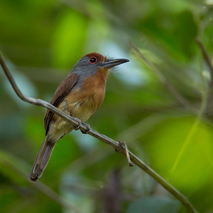 Mede cerca de 13,5 cm de comprimento. Fronte e coroa castanho-avermelhada; pálpebra intumescida, vermelha no adulto e parda-amarelada no imaturo; face, pescoço posterior e lados do corpo cinzentos; peito ocre; abdome brancacento; dorso marrom.