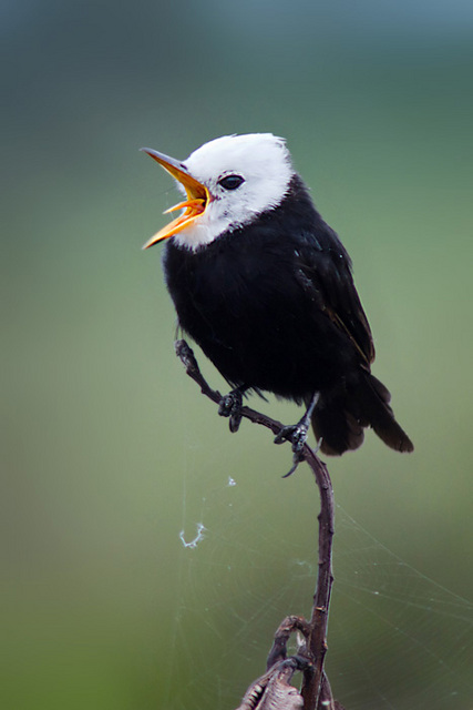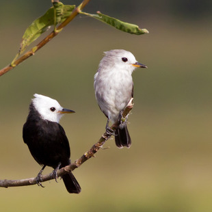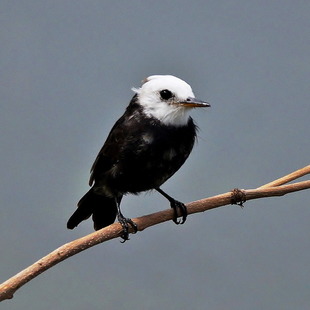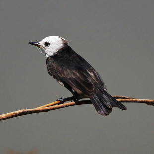 O macho é quase todo preto, com apenas a cabeça e a garganta brancas. A fêmea tem as partes superiores marrom-acinzentadas, as inferiores esbranquiçadas e apenas a testa branca. Os imaturos são acinzentados.