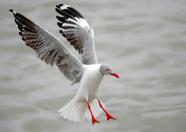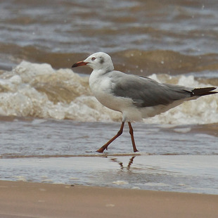 Mede de 38 a 44 centímetros. O jovem apresenta plumagem diferente do adulto, com tons marrons e partes cinzentas apenas esboçada. Adultos fora da plumagem reprodutiva não apresentam a cabeça inteiramente cinza com borda preta, só uma “orelha” cinza claro. O adulto é semelhante à gaivota-maria-velha(Chroicocephalus maculipennis), sendo diferenciado principalmente pela cabeça cinza ao invés de marrom escuro.