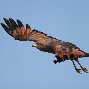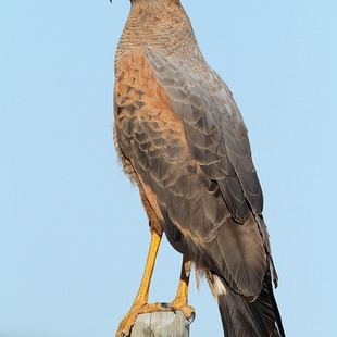 A espécie mede cerca de 55 centímetros de comprimento, com plumagem ferrugínea. O adulto é todo marrom avermelhado, com a ponta das asas e cauda negras e penas longas. Possui uma faixa branca, estreita, na cauda. Pernas e pele nua das narinas, amarelas. Bico negro e olho marrom avermelhado. Como em outros gaviões, o jovem é muito diferente. Cores apagadas, cinza amarronzado nas costas e barriga creme, com riscos verticais escuros e uma semi-coleira escura. Sobre os olhos, uma listra clara. A cauda é creme, com finas listras escuras. Faixa larga subterminal negra. Penas longas das asas com listras finas e ponta negra.