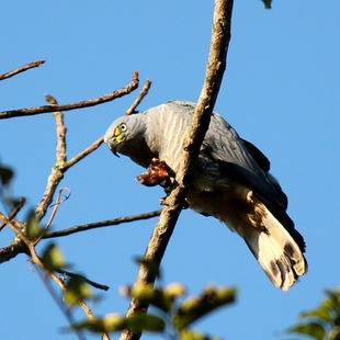 Preda insetos, aranhas, lagartixas (Anolis sp.) e anfíbios arborícolas, investindo a partir de poleiros fixos ou pulando de galho em galho. Sabe-se que grande parte da população desta espécie alimenta-se principalmente de caramujos arborícolas, terrestres ou aquáticos. Retira o molusco perfurando o contro de espirais internas das conchas com seu bico fino e adunco, de maneira completamente diferente do gavião-caramujeiro (Rosthramus sociabilis). Consta que por vezes pode engolir certos moluscos inteiros, sem danificar a concha.