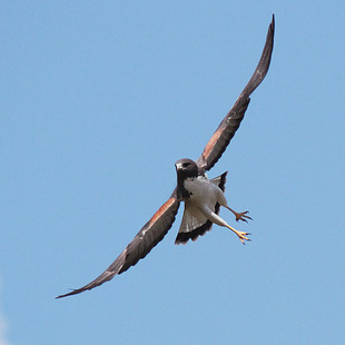Atinge 55 centímetros de comprimento. É um gavião grande podendo ser encontrado dentro de cidades. Constrói o ninho sobre árvores ou rochas com galhos secos. Pesa cerca de 950 a 980 gramas. Ave de rapina de porte compacto, com plumagem negro-acizentada, com exceção do entorno dos olhos, que é branco, e a cauda, que é branca e barrada de preto. Tem o bico negro-acinzentado e o cerume amarelado.