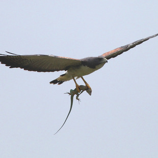 Alimenta-se de insetos, répteis, mamíferos, anfíbios e até outras aves de menor porte. Também vasculha estradas em busca de animais atropelados. É menos um predador especializado do que um generalista, que se concentra em presas de pequeno tamanho e de fácil captura. Pratica a caça de espreita lançando-se sobre a presa de um galho, tronco, estaca ou mesmo de postes de iluminação. Plana muito a procura de alimento, tem o costume de peneirar pastos abertos em busca de presas. Procura queimadas para capturar animais no solo ou em pleno ar espantados pela fumaça.