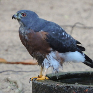 É uma ave de rapina razoavelmente pequena, medindo cerca de 31 a 35 centímetros, apesar de ser da família Accipitridae, é muito semelhante aos falcões. Possui cabeça cinza, olhos vermelhos, garganta branca com listras escuras, ombros avermelhados, os pés amarelos e a cauda escura com as três faixas e uma ponta branca. Possui um “dente duplo” na mandíbula superior.