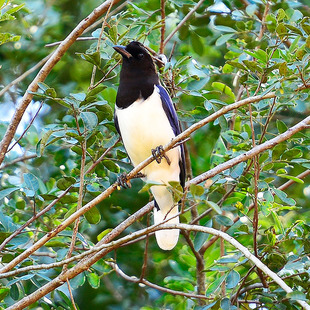 Asas longas e cauda curta. Tem um característico topete frontal alongado. Plumagem azul-escura; parte interior do pescoço e garganta preta; barriga e ponta da cauda brancas. Alcança até 35 centímetros de comprimento.