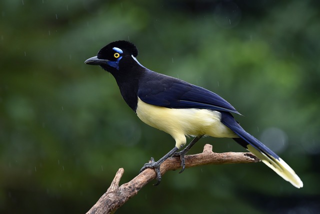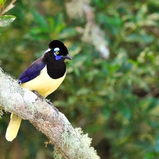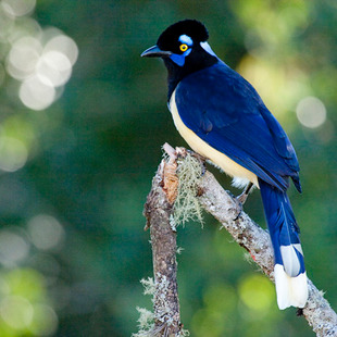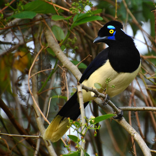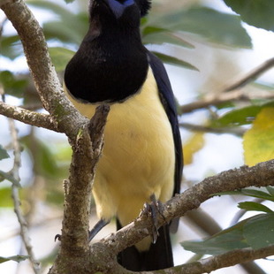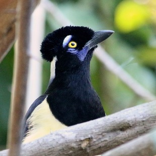 É azul ultra marinho, exceto na cabeça, o pescoço anterior e a garganta são negros, branco no peito, barriga e ponta de cauda. As penas negras do píleo formam uma almofada, saliente no occipital como uma bola, destaca-se uma mancha pós ocular e a nuca azul-esbranquiçada reluzente e mais um desenho azul sob o olho e o bigode, íris amarelo-enxofre, barriga e parte terminal da cauda branco-amareladas (ou branco-puro em população amazônica) Possui em média 34 centimetros de comprimento, 17 centimetros de cauda e aspecto delgado. Possui um canto tagarelante, imita vozes de outras aves e mamíferos