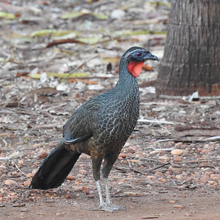 Mede cerca de 55 centímetros de comprimento e pesa 850 gramas. Barbela nua e vermelha, mais proeminente no macho, topete rudimentar, plumagem das asas com bordas ferrugíneas, desenho esbranquiçado no peito. e íris vermelha. Sobrancelha cinza claro ou pardacento claro.